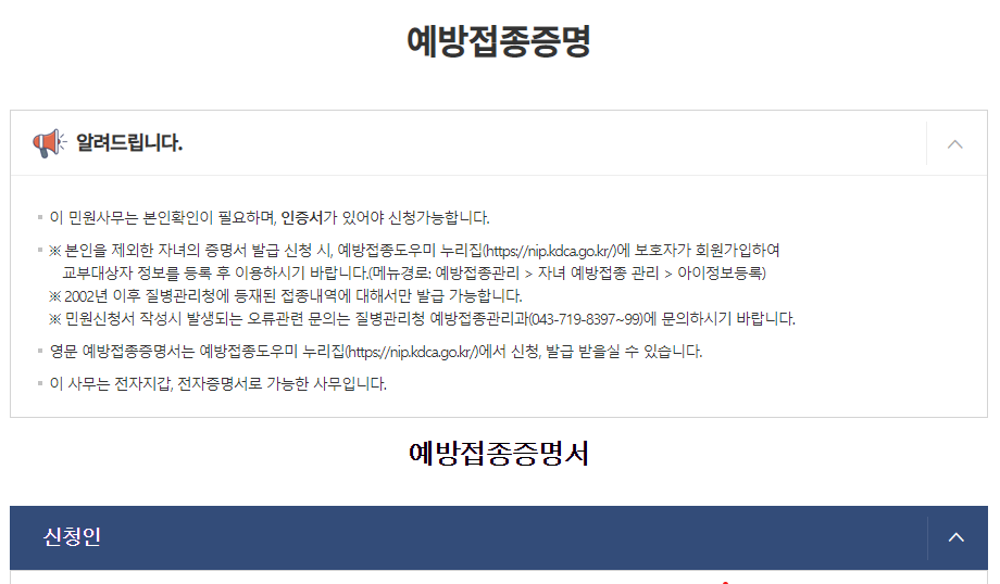 2. 전자민원 서비스 > 예방접종증명서 로 들어가 주세요.