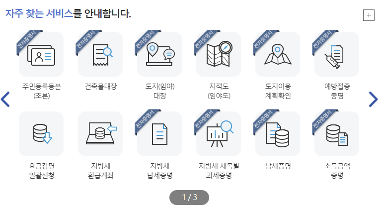 - 그리고 이어서 가운데 화면에 보면(아래 오른쪽 사진) 여러가지 "자주 찾는 서비스" 항목이 나옵니다.